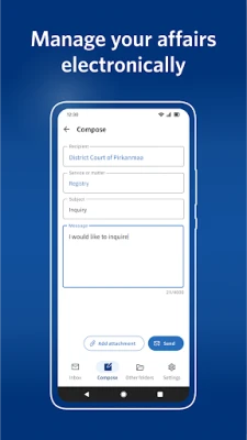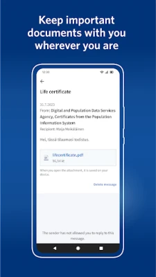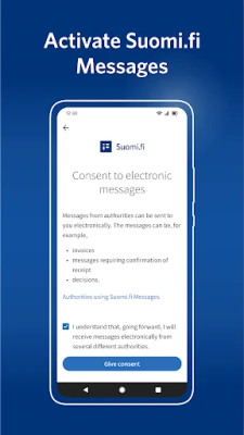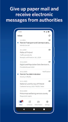 Suomi.fi rakendusega saate ametiasutuste saadetud sõnumeid, arveid ja otsuseid elektrooniliselt otse oma seadmesse. Unustage paberpost – võtke vastu olulised teated digitaalselt ja mugavalt. Teenuse eest vastutab Digitaal- ja Rahvastikuandmete Amet.
